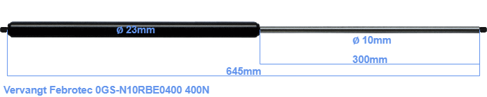 De diameter van het huis van deze gasveer is 23 millimeter. De diameter van de stang bedraagt 10 mm. De slag (het inschuivende gedeelte) heeft een lengte van 300 mm. De algehele lengte van deze vervanger is 645 millimeter. Dit is de afstand tussen de twee middelpunten van de aanbouwdelen. De afstand van schroefdraad tot schroefdraad (oftewel zonder aanbouwdelen) is 645 mm. Deze vervangende gasveer (0GS-N10RBE0400) heeft een kracht van 400 Newton (N). Deze gasveer kan een Febrotec gasveer vervangen, maar is geen originele gasveer van Febrotec. Deze gasveer is geproduceerd door Hahn. Toch zijn de afmetingen en kracht bijna gelijk.