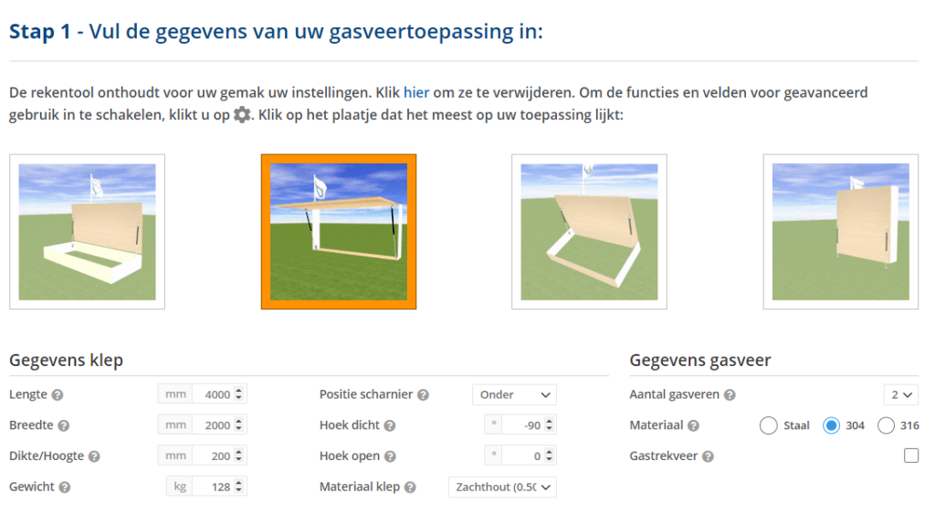 Je hoeft niet zelf jouw gasveer afmetingen te berekenen, dat doet onze tool. Fijn toch? De tool heeft alleen wel wat informatie nodig. Dit gaat om het volgende: