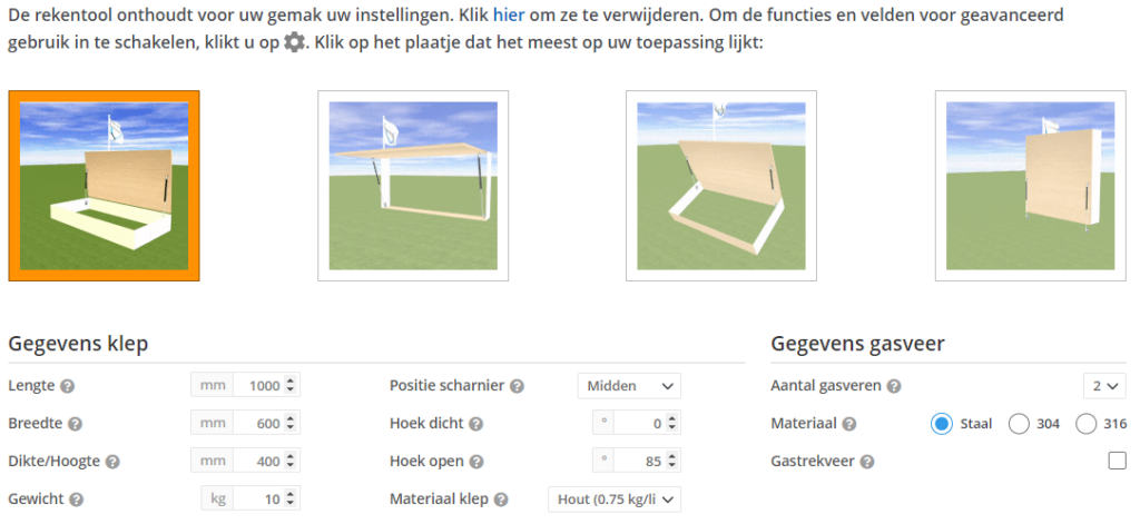 Zie onderstaand een voorbeeldberekening voor een gasveer van een salontafel:
