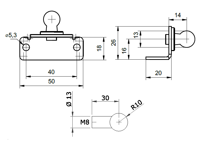 Kogelgewricht, met beugel aan de buitenzijde, voor een gasveer met 8 of 10mm stangdiameter en M8 schroefdraad. Het kogelgewricht zorgt voor een verlenging van 30mm van de inbouwlengte en kan zowel aan de stang- als aan de huiszijde worden bevestigd. De beugel heeft een hoogte van 16mm. De kogel heeft een diameter van 13mm.
