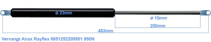 De diameter van het dikkere huis van deze gasveer is 23 millimeter. De diameter van de stang bedraagt 10 mm. Het chromen gedeelte, heet de stang. Deze heeft een lengte van 200 mm. De totale lengte van deze vervangende gasveer is 483 mm. Houd er rekening mee dat dit de lengte is tussen de middelpunten van de aanbouwdelen. Zonder aanbouwdelen is deze gasveer 445 mm lang (van schroefdraad tot schroefdraad). Deze vervangende gasveer (6851252209501) heeft een kracht van 950 Newton (N). Dit is geen originele gasveer van Airax Rayflex, maar kan wel een Airax Rayflex gasveer vervangen. Dit is een gasveer van Hahn. Toch kan deze gasveer als vervanger gebruikt worden, want de afmetingen en kracht zijn vrijwel gelijk.