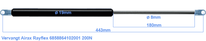 De diameter van het huis van deze gasveer is 19 mm. De stang heeft een diameter van 8 mm. De slag (het inschuivende gedeelte) heeft een lengte van 180 mm. De totale lengte van deze vervangende gasveer is 443 mm. Houd er rekening mee dat dit de lengte is tussen de middelpunten van de aanbouwdelen. Zonder aanbouwdelen is deze gasveer 405 mm lang (van schroefdraad tot schroefdraad). De kracht van deze vervanger is 200 Newton. Let op: dit is geen officiële gasveer van Airax Rayflex, maar een vervangende gasveer. Deze gasveer is geproduceerd door Hahn. Toch zijn de kracht en afmetingen vrijwel geheel gelijk.