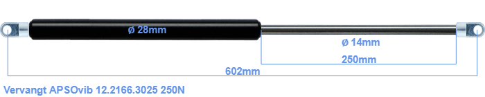 De diameter van het dikkere huis van deze gasveer is 28 millimeter. De diameter van de stang bedraagt 14 mm. De stang (het deel dat buiten het huis valt) is 250 mm lang. De totale lengte van deze vervangende gasveer is 602 mm. Let op: dit is de lengte tussen de middelpunten van de aanbouwdelen. De afstand van schroefdraad tot schroefdraad (oftewel zonder aanbouwdelen) is 548 mm. Deze gasveer (12.2166.3025) heeft een kracht van 250 Newton. Let op: dit is geen officiële gasveer van APSOvib, maar een vervangende gasveer. Hahn Gasfedern is verantwoordelijk voor de productie van deze vervanger. Toch zijn de afmetingen en kracht bijna gelijk.