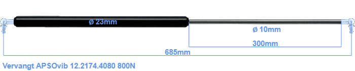 De diameter van het dikkere huis van deze gasveer is 23 millimeter. De diameter van de stang bedraagt 10 mm. Het chromen gedeelte, heet de stang. Deze heeft een lengte van 300 mm. In totaal bedraagt de lengte 685 millimeter. Houd er rekening mee dat dit de lengte is tussen de middelpunten van de aanbouwdelen. De lengte van schroefdraad tot schroefdraad (zonder aanbouwdelen) is 645 mm. De kracht van deze vervanger is 800 Newton. Dit is geen officiële APSOvib gasveer, maar een zogenoemde vervanger. Hahn Gasfedern is verantwoordelijk voor de productie van deze vervanger. Toch zijn de kracht en afmetingen vrijwel gelijk.