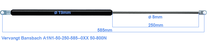 De diameter van het huis van deze gasveer is 19 millimeter. De diameter van de stang bedraagt 8 mm. Naast het huis bevindt zich de slag met een grootte van 250 millimeter. De totale lengte van deze vervangende gasveer is 585 mm. Dit is de afstand tussen de twee middelpunten van de aanbouwdelen. De lengte van schroefdraad tot schroefdraad (zonder aanbouwdelen) is 545 millimeter. Deze gasveer (A1N1-50-250-585--0XX) heeft een kracht van 50-800 Newton. Deze gasveer kan een Bansbach gasveer vervangen, maar is geen originele gasveer van Bansbach. Hahn Gasfedern is verantwoordelijk voor de productie van deze vervanger. De gasveer is zonder problemen te gebruiken als vervanger, want de afmetingen en kracht zijn vrijwel geheel gelijk.