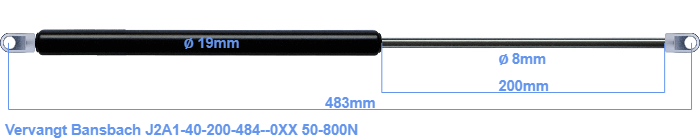 Deze gasveer heeft een huis met een diameter van 19 mm. De diameter van de stang is 8 millimeter. Het chromen gedeelte, heet de stang. Deze heeft een lengte van 200 mm. De algehele lengte van deze vervanger is 483 millimeter. Het gaat hier om de totale lengte tussen de middelpunten van de twee aanbouwdelen. De lengte van schroefdraad tot schroefdraad (zonder aanbouwdelen) is 445 mm. Deze gasveer (J2A1-40-200-484--0XX) heeft een kracht van 50-800 Newton. Dit is geen officiële Bansbach gasveer, maar een zogenoemde vervanger. De Duitse fabrikant Hahn heeft deze vervangende gasveer gefabriceerd. De kracht (50-800 N) en afmetingen zijn vrijwel identiek aan het origineel.