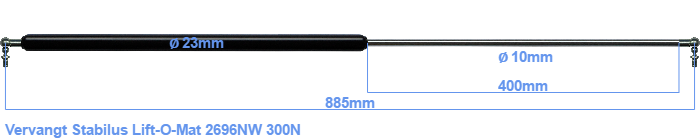 De diameter van het huis van deze gasveer is 23 millimeter. De diameter van de stang is 10 millimeter. Naast het huis bevindt zich de slag met een grootte van 400 millimeter. De algehele lengte van deze vervanger is 885 millimeter. Let op: dit is de lengte tussen de middelpunten van de aanbouwdelen. De afstand van schroefdraad tot schroefdraad (oftewel zonder aanbouwdelen) is 845 mm. Deze gasveer (2696NW) heeft een kracht van 300 Newton. Dit is geen officiële Stabilus Lift-O-Mat gasveer, maar een zogenoemde vervanger. Dit is een gasveer van Hahn. De kracht (300 N) en afmetingen zijn bijna identiek aan het origineel.