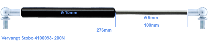 De diameter van het dikkere huis van deze gasveer is 15 millimeter. De diameter van de stang bedraagt 6 mm. De stang (het deel dat buiten het huis valt) is 100 mm lang. In totaal bedraagt de lengte 276 millimeter. Opmerking: dit is de totale lengte tussen het middelpunt van het aanbouwdeel aan de linkerkant en het middelpunt van het aanbouwdeel aan de rechterkant. Zonder aanbouwdelen is deze gasveer 232 mm lang (van schroefdraad tot schroefdraad). Deze gasveer (4100093-) heeft een kracht van 200 Newton. Let op: dit is geen officiële gasveer van Stobo, maar een vervangende gasveer. Hahn Gasfedern is verantwoordelijk voor de productie van deze vervanger. De gasveer is zonder problemen te gebruiken als vervanger, want de afmetingen en kracht zijn gelijk.